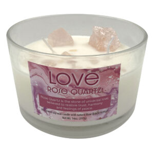 The 14oz. crystal candle is made with soy wax and includes 2 wicks for even burning. Embedded in the wax are Rose Quartz stones which are believed to help radiate vibes of unconditional love, heal the heart from trauma, grief and heartbreak and it draws off negative energy and replaces it with loving vibes. To attract love, put your candle in a special place in your home. Once your candle has burned, retrieve your crystal and carry it with you to manifest feelings of love.