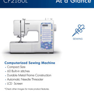 - At Your Side Support: The CP2160L sewing machine comes with Brother At Your Side support, offering free technical support via online, live chat, or phone for the life of your machine.