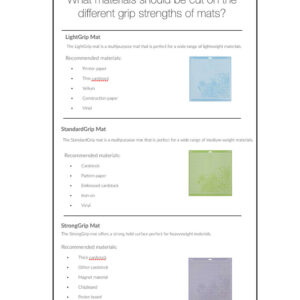 This mat works great with a little bit heavier materials! It can be used to cut thick cardstock, glitter cardstock, magnet material, chipboard, and fabric with stiffener. This package contains one 12×12 inch strong grip cutting mat. Imported.