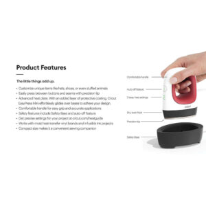 Bring on the ususual objects and improbable projects. Now you can get professional heat-transfer results with Cricut EasyPress Mini! Whether it’s a shapely object or an extra-small and unique project, including baby shoes, hats, stuffed animals, and more, you’ll have what it takes to make a successful heat transfer. The design is compact and thoughtful, so you can easily curve with contours, get between buttons, and even squeeze into seams. Three heat settings are all you need for every heat-transfer project, including Infusible Ink transfers when used on a compatible blank. An insulated base and an auto-shutoff feature are safety features you’ll love. Plus it’s lightweight, portable, and easy to store. Works with major brands of HTV, iron-on, and the entire Infusible Ink family of products. It’s a perfect complement to any Cricut cutting machine.