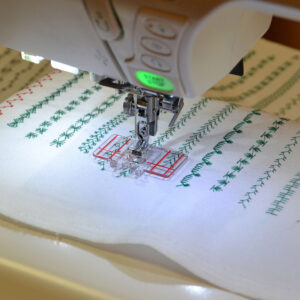 Having problems lining up or evenly spacing your border designs? Now the Border Guide Foot helps you to easily match up your border designs with the red lines of the foot. No need to mark every row beforehand! The secret to the border guide foot lies in the red guide marks. The two sets of vertical red lines are calibrated to allow perfect spacing of rows. The horizontal red line matches the needle drop so you can line up the start of each row. The small red mark denotes the center of the design for lining up with the marking for the first row.