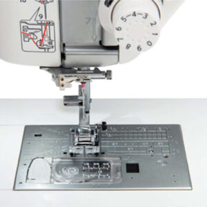 This top drop-in bobbin system has a full rotary metal hook which moves in one direction, runs quietly, and requires less lubrication than front loading bobbin system sewing machines. The bobbin cover has a printed loading diagram to ensure proper insertion and the plate itself includes all of the hemming, seaming, or angled quilting guides you could need.