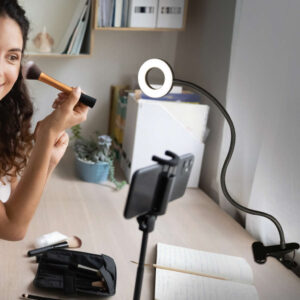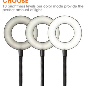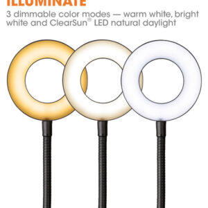 Grab the perfect selfie, shine some extra light for your video call, light your workspace beautifully. The OttLite Dimmable Ring Light with Clip provides versatile lighting that you can position perfectly with the 20+-inch long neck and sturdy clip. Great as a desk lamp for reading, computer work and projects, this ring light features ClearSun LED technology to reduce eyestrain and glare. And, with three dimmable color temperatures (warm light, bright white and ClearSun natural daylight), you can easily create the lighting effect you want. To operate, simply plug into a standard USB port on your computer or adaptor (adaptor not included).