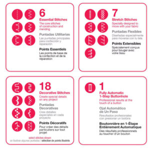 - One-Step Buttonhole- Buttonhole sewing is a one-step simple process. Just place your button in the foot’s holder, and the machine will stitch a buttonhole perfectly sized for your button, with consistent results every time.