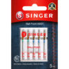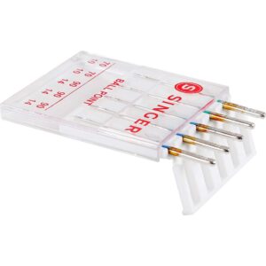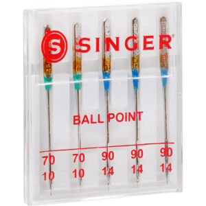 - The pack of 5 SINGER ball point sewing machine needles allows you to perform multiple standard stitching projects on knit fabrics. Ball point needles are best used on knit fabrics. Machine needles are color coded to their sizes, which include: 3 green size 70/10 and 2 orange size 80/12 for use on lightweight fabrics. The needle kit comes in an easy-to-store plastic container with sizes marked on the cover for easy location and replacement. The SINGER sewing machine needles can be used on SINGER, Brother, Kenmore, Bernina, Janome, Juki and other quality household domestic sewing machines. Domestic machines needles are not compatible with industry sewing machines.