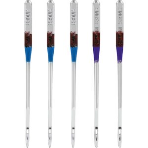 - Easy color code system to help identify needle type and size; blue, size 90/14 and purple size 100/16