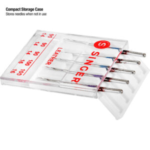 - The pack of 5 SINGER leather sewing machine needles allows you to cut through leather and other heavy non-woven imitation leathers and suedes without creating large holes. Due to the needle’s wedge shape slightly sharp cutting point, never use it on woven or knit fabrics. Machine needles are color coded to their sizes, which include: 3 blue size 90/14 and 2 purple size 100/16 for use on heavy to extra heavy weight materials. The needle kit comes in an easy-to-store compact transparent case with the sizes marked on the cover for easy recognition. The SINGER sewing machine needles can be used on SINGER, Brother, Kenmore, Bernina, Janome, Juki and other quality household domestic sewing machines. Domestic machines needles are not compatible with industry sewing machines.
