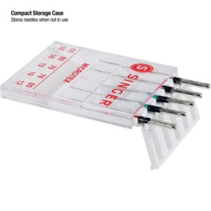 Get perfectly straight stiches in your sewing projects with the Singer Assorted Universal Microtex Sewing Machine Needles. This set of five multi-sized machine needles are designed with thin, sharp points. These needles come in three sizes of 70/09 that can be used on sheer, lightweight fabrics, 60/08 that are ideal to be used on lightweight fabrics and 80/11 that are perfect to be used on silk and other lightweight woven fabrics. They can be used with Singer, Brother, Kenmore and other quality sewing machines. The needles come in a thin, durable case with needle sizing marked on the clear cover.