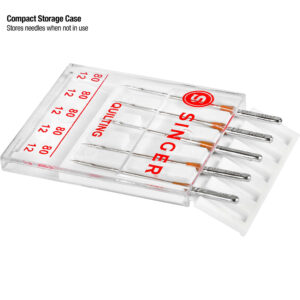 The Singer Universal Quilting Sewing Machine Needles are designed to stitch through multiple layers of fabric and are great for quilting, blanket and patchwork. Designed with a special tapered point and light ball point, they are ideal to be used on lightweight woven fabrics. They are of size 80/11 and compatible with Singer, Brother, Kenmore and other quality sewing machines. These needles come in a thin, durable case with a clear cover.