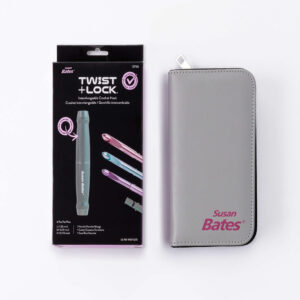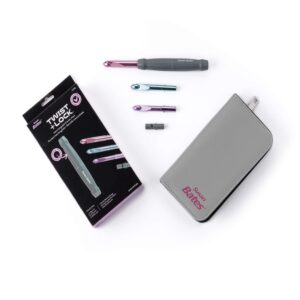 Crocheting just became easier with the new Susan Bates Twist + Lock Interchangeable Crochet Hook set, now comes in a travel friendly zippered case for easy storage! Select the desired hook size and insert into the opening of the oversized soft and ergonomic handle. With a simple Twist and Lock, your crochet hook will fit snugly in place whether in action or in storage. The hooks are made with lightweight aluminum and have velvetly smooth finish. With the hook on one side, and yarn cutter on the other- customize it however you like!